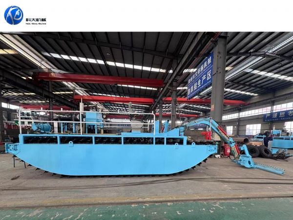水陆两栖割草船装车发哈萨克斯坦,水陆两栖割草船也叫做两栖式多功能船,该船采用浮箱履带式试机,既可以在陆地上行走,又能在水上工作,配有挖斗、割草斗、收集耙、T型割等工作单元,可以完成挖掘、收割、排泥、清理杂草垃圾等工作。